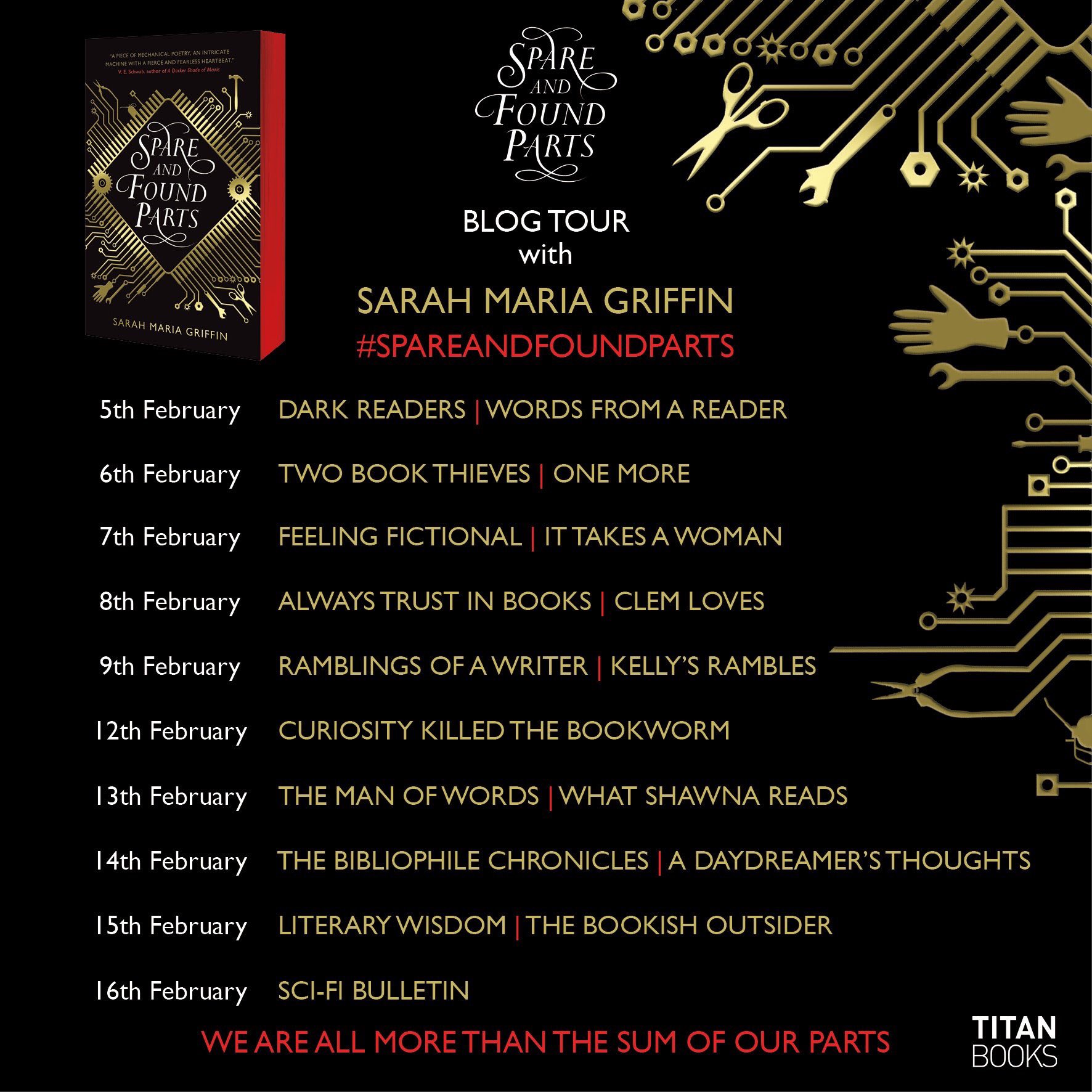 Hi everyone! Today I’m here for my stop on the #SpareandFoundParts blog tour to celebrate the release of this fabulous book! You can find my review below and be sure to check out all the other stops on the tour along the way. Check my Twitter from 9am for your chance to win 1 of 2 copies of the book courtesy of the lovely people at Titan Books!